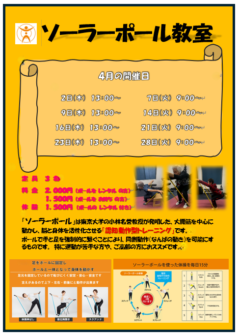 この「ソーラーポール」と言うのは、手と足をポールでつなげる事により、強制的に同側の動き(なんばの動き)にする体操です。